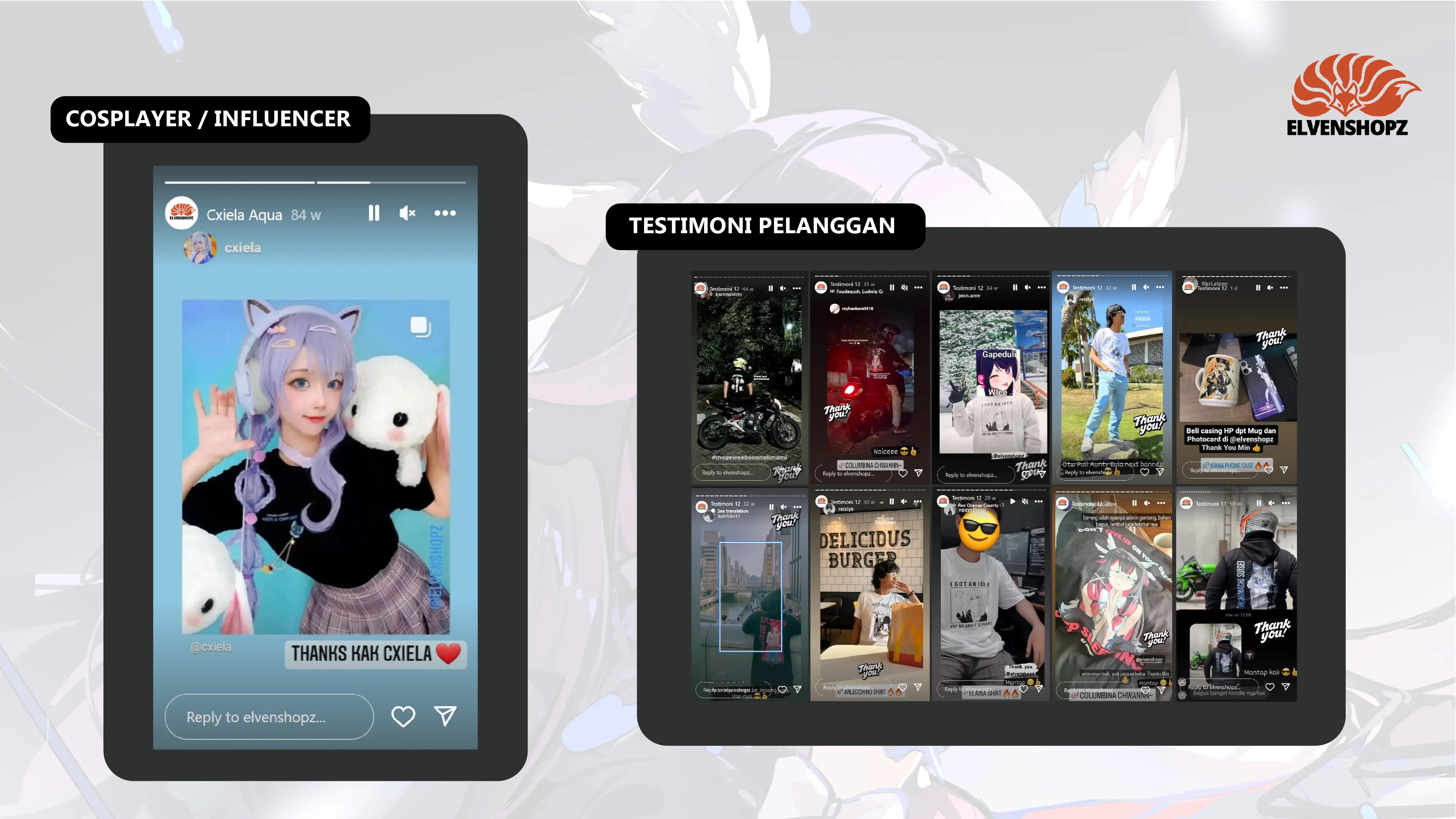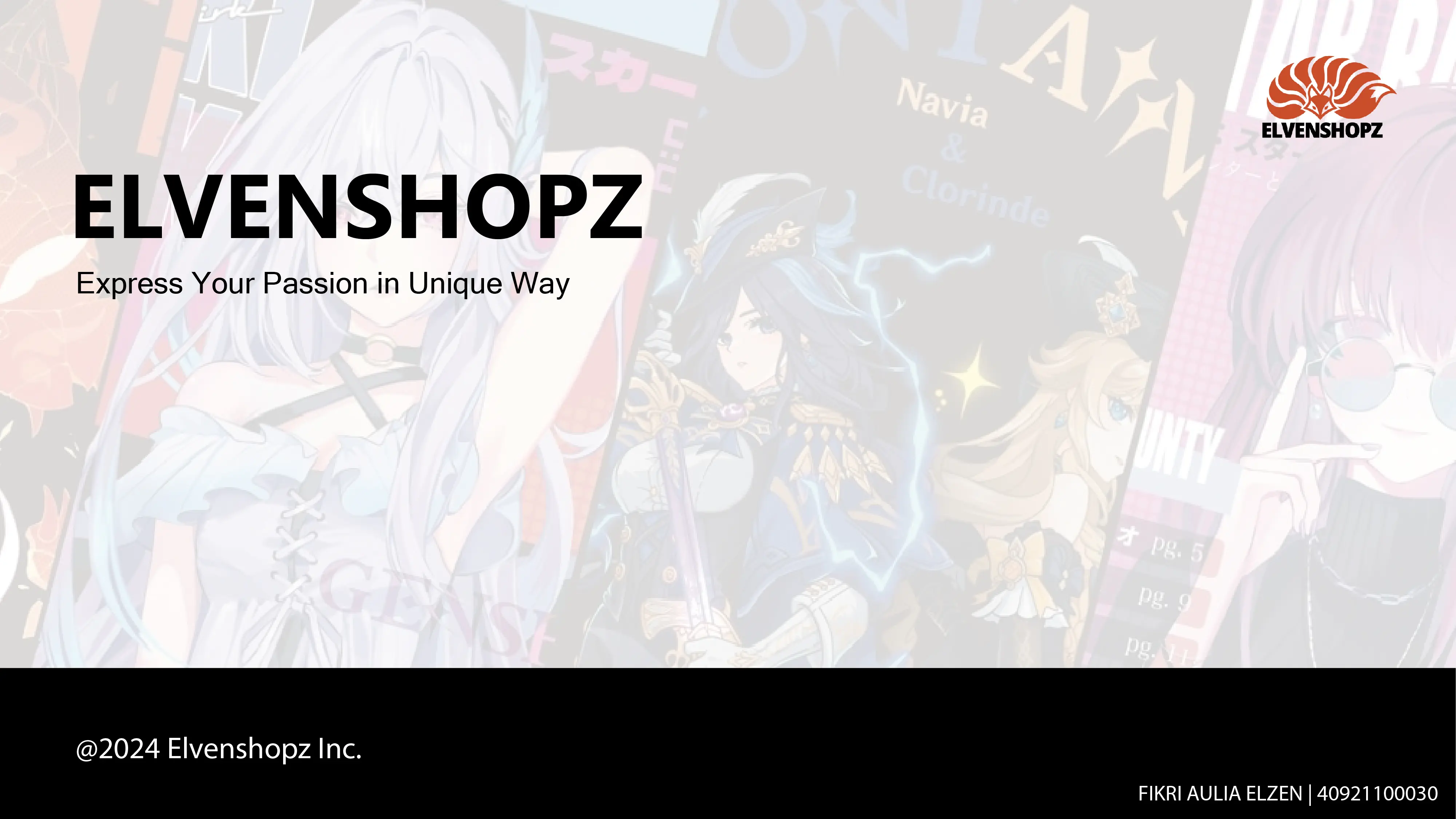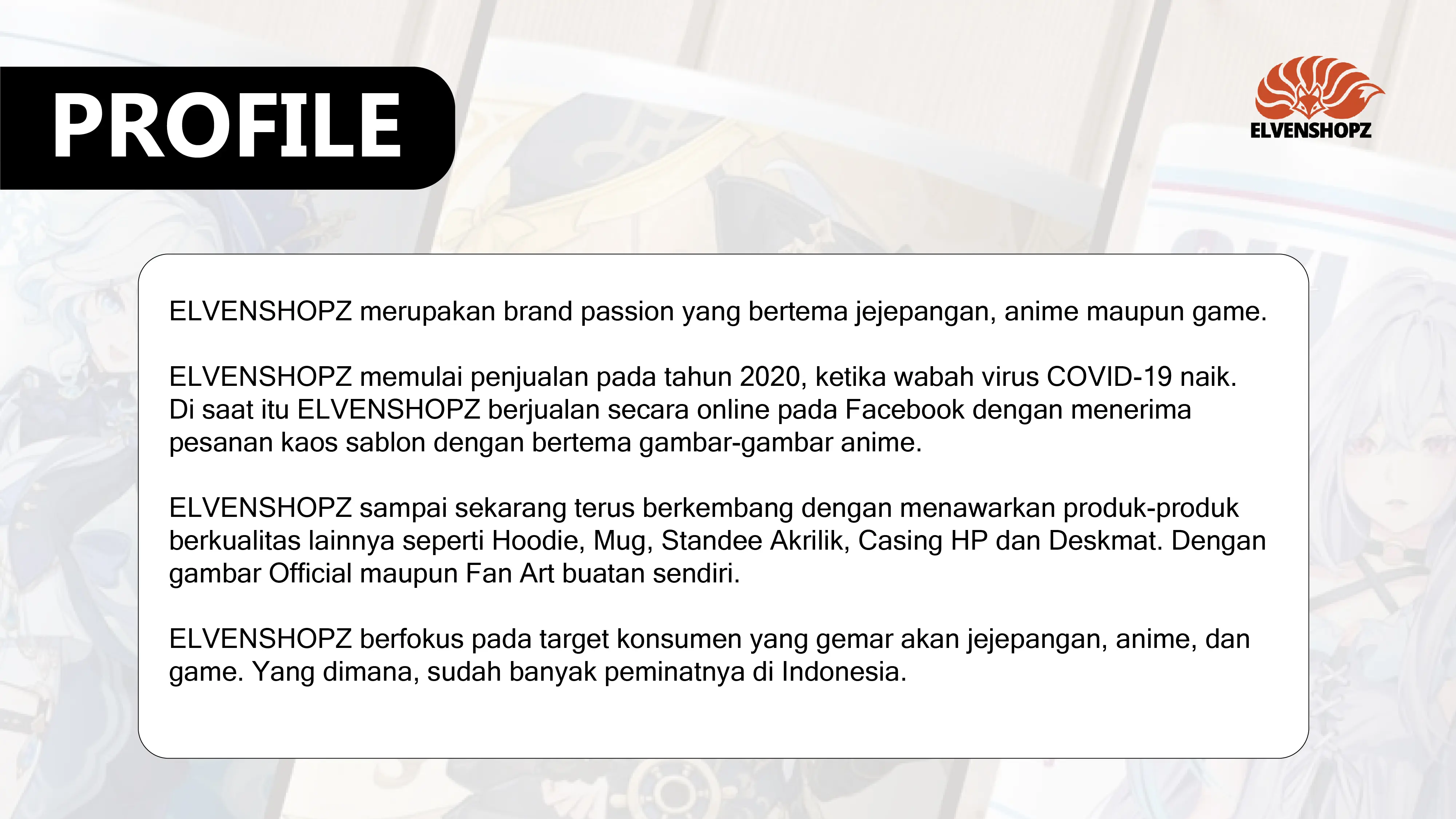 ELVENSHOPZ merupakan brand passion yang bertema jejepangan, anime maupun game. ELVENSHOPZ memulai penjualan pada tahun 2020, ketika wabah virus COVID-19 naik.