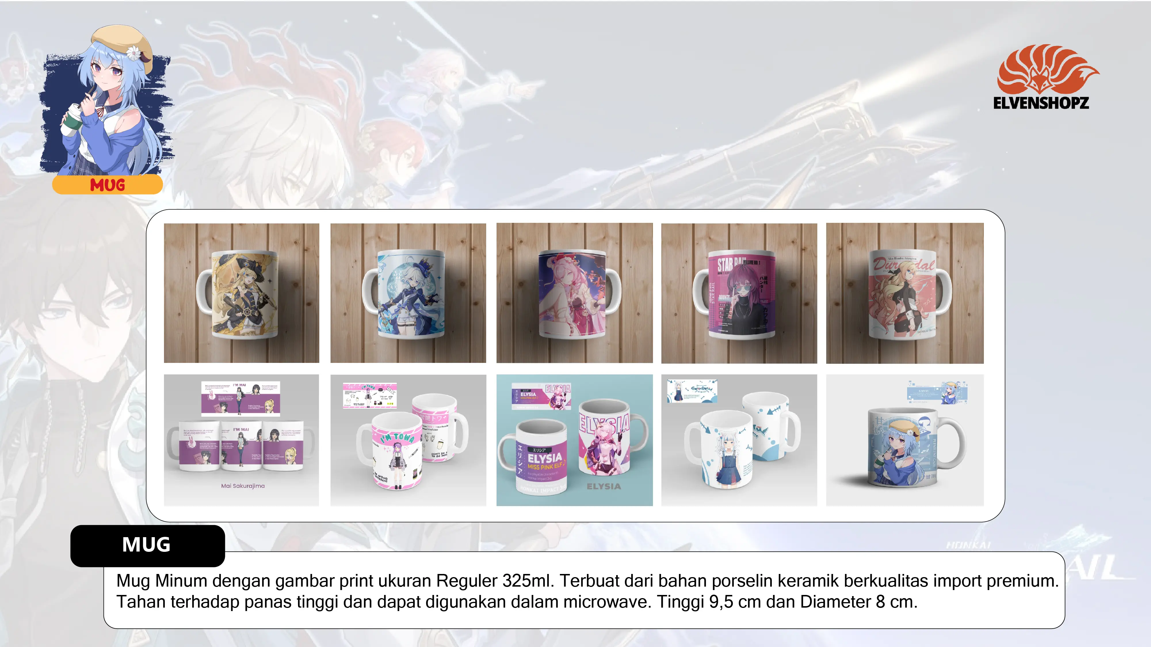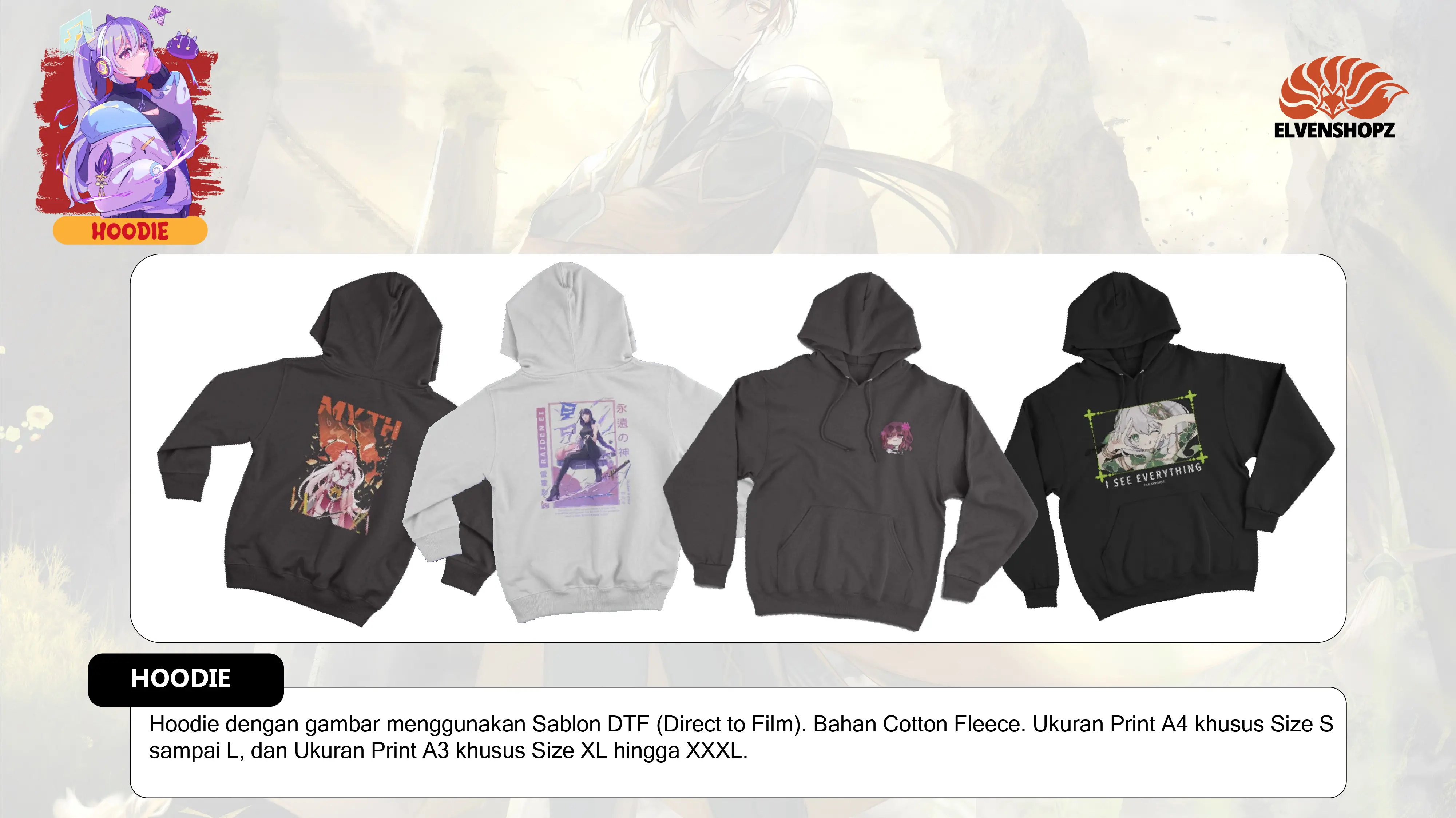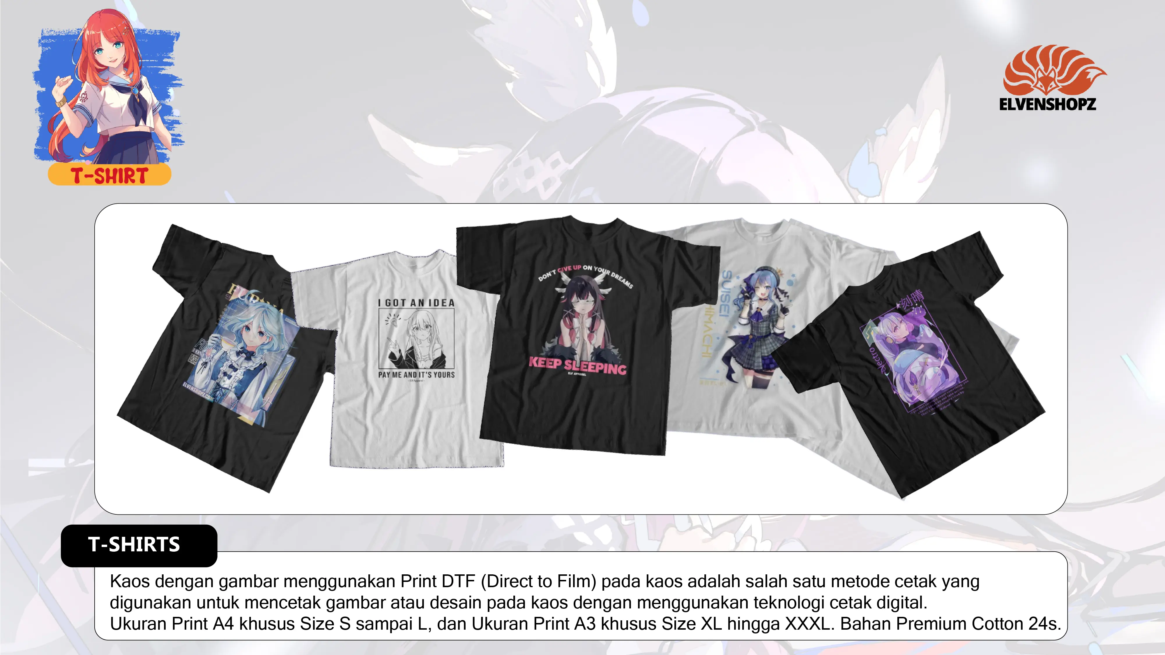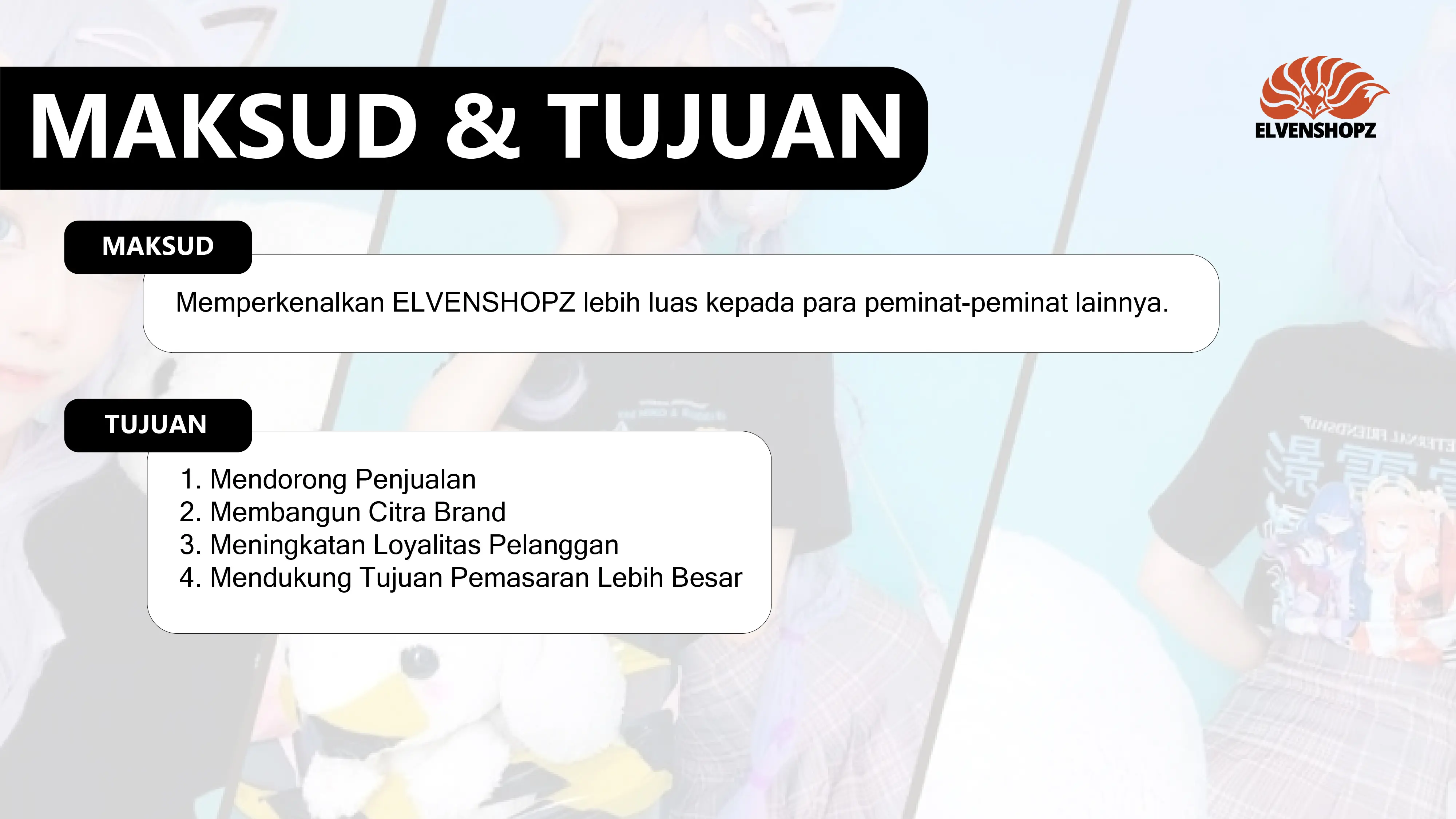 Dengan gambar Official maupun Fan Art buatan sendiri. ELVENSHOPZ berfokus pada target konsumen yang gemar akan jejepangan, anime, dan game. Yang dimana, sudah banyak peminatnya di Indonesia.