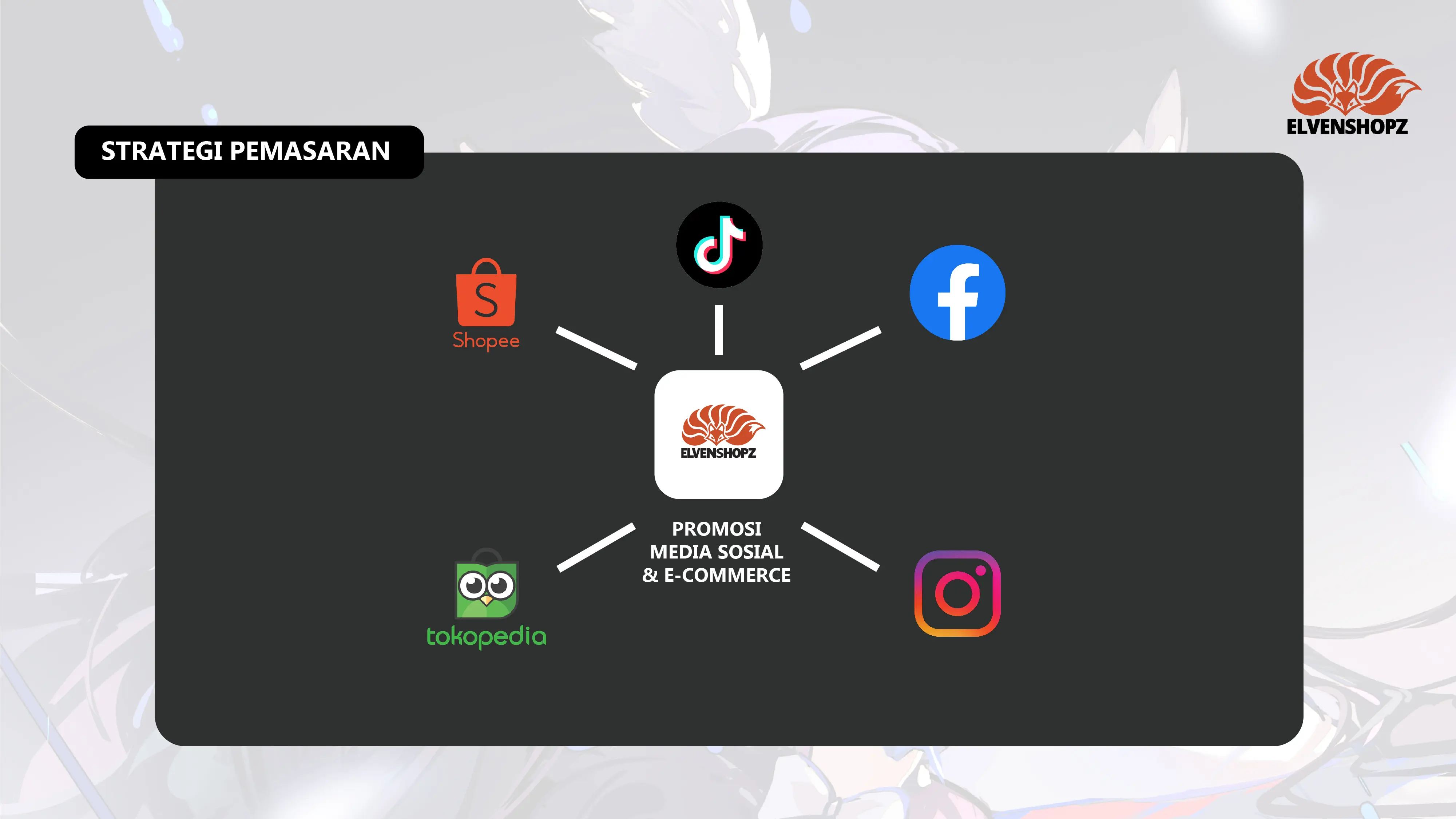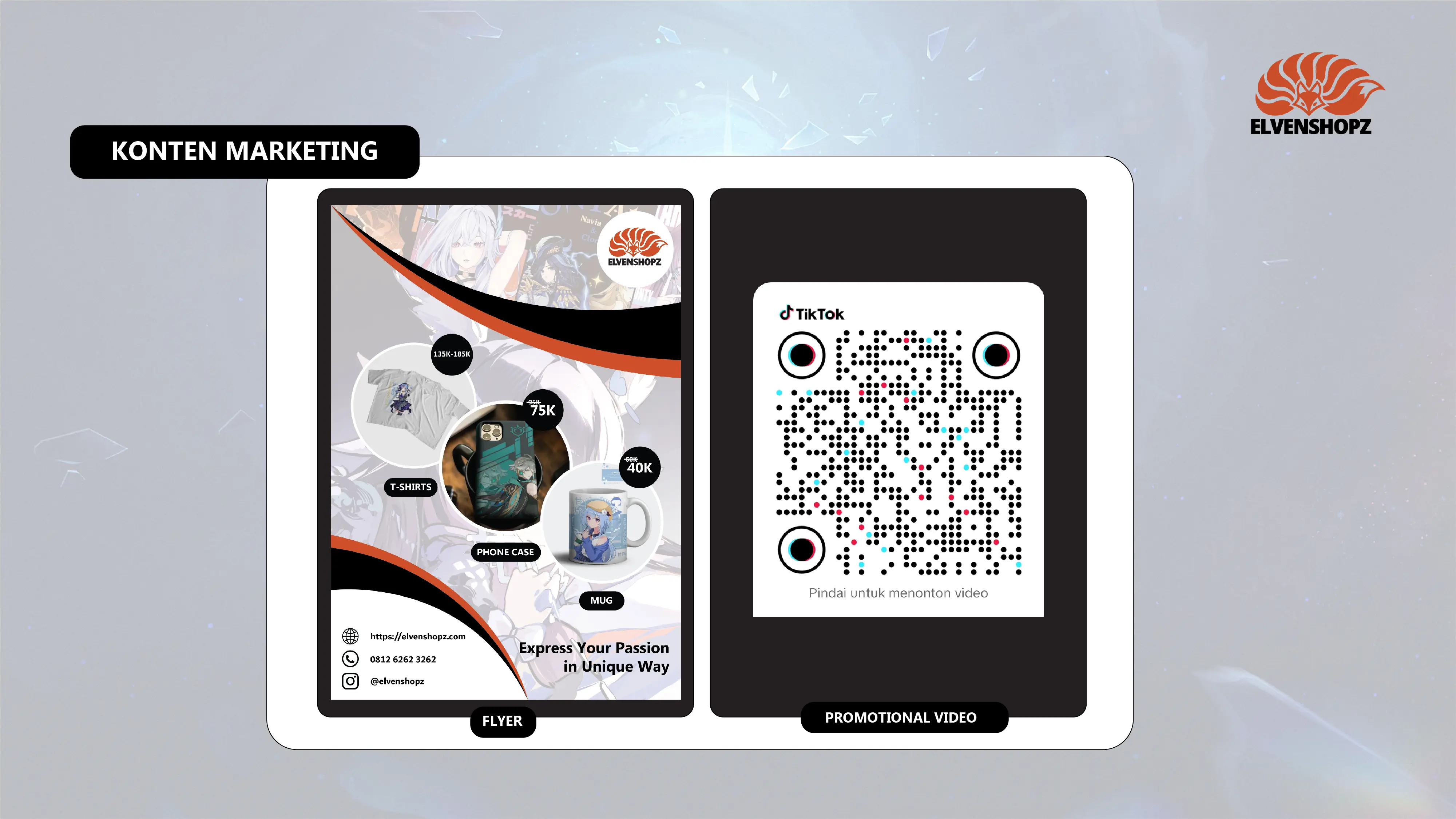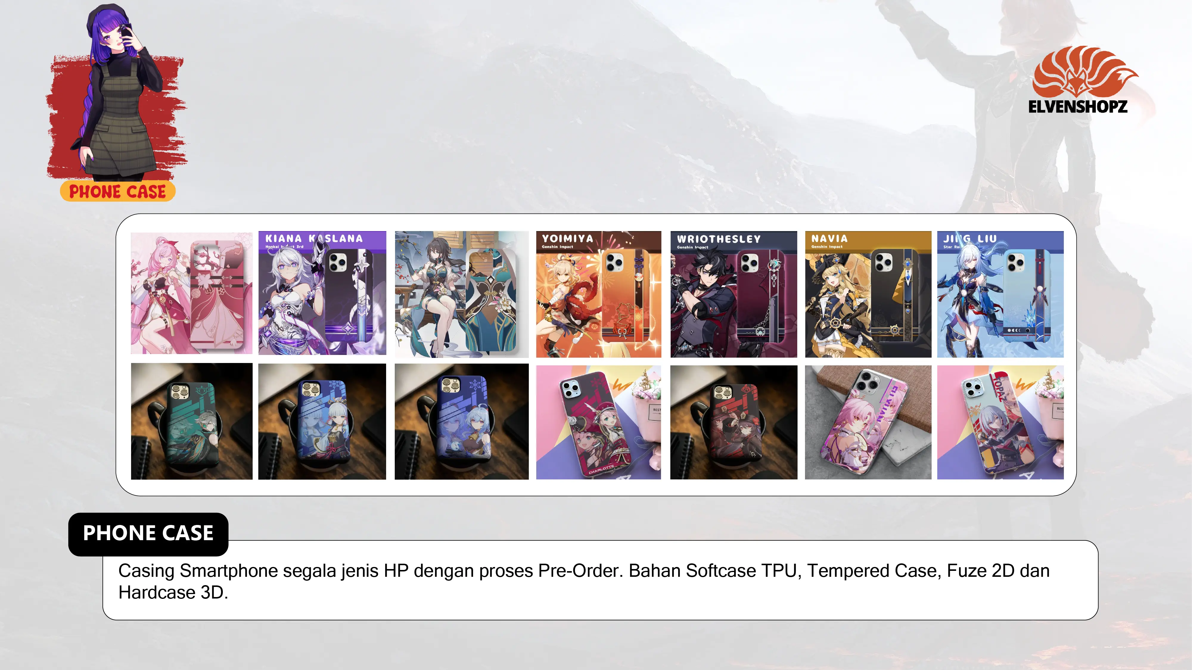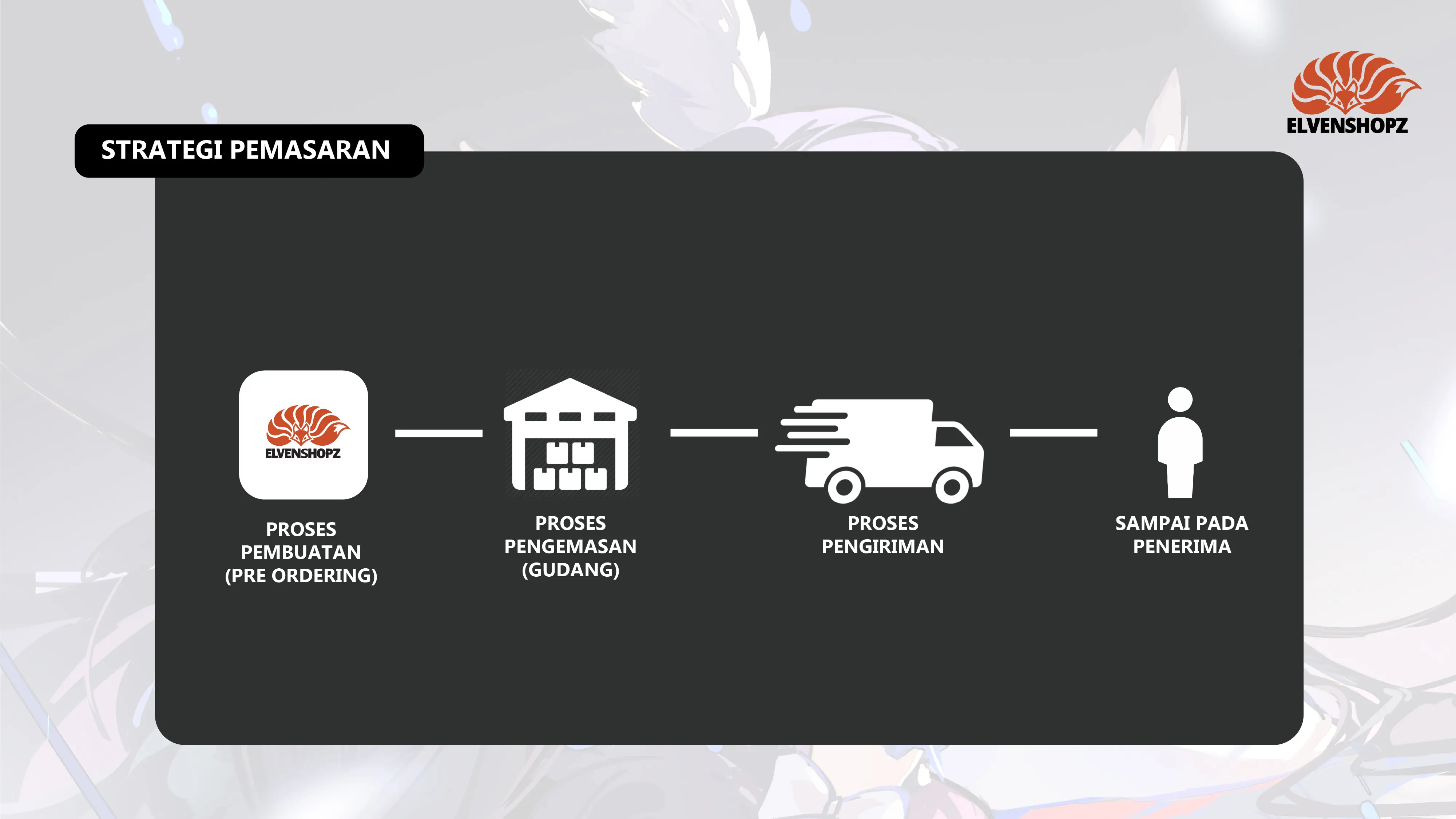 Dengan gambar Official maupun Fan Art buatan sendiri. ELVENSHOPZ berfokus pada target konsumen yang gemar akan jejepangan, anime, dan game. Yang dimana, sudah banyak peminatnya di Indonesia.